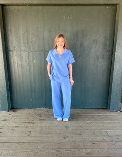 This blue loungewear set combines thoughtful design with premium comfort. The quarter zip top offers versatile styling options, while the coordinating full-length pants create a polished, put-together look. Crafted from exceptionally soft fabric, the set delivers the cozy feel you need without compromising on quality or sophistication. Available in sizes small through large, it's an essential addition to any wardrobe seeking both relaxation and refined casual wear.